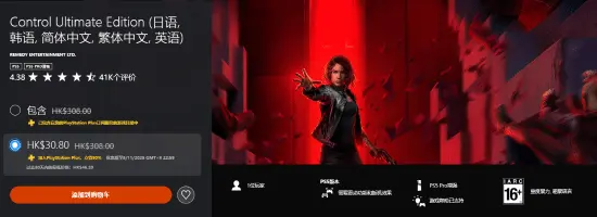 本作原价为308港元,优惠价46.2港元,为平史低。但如果是PS Plus会员的话,有额外5%的折扣,优惠价30.8港元,为新史低。