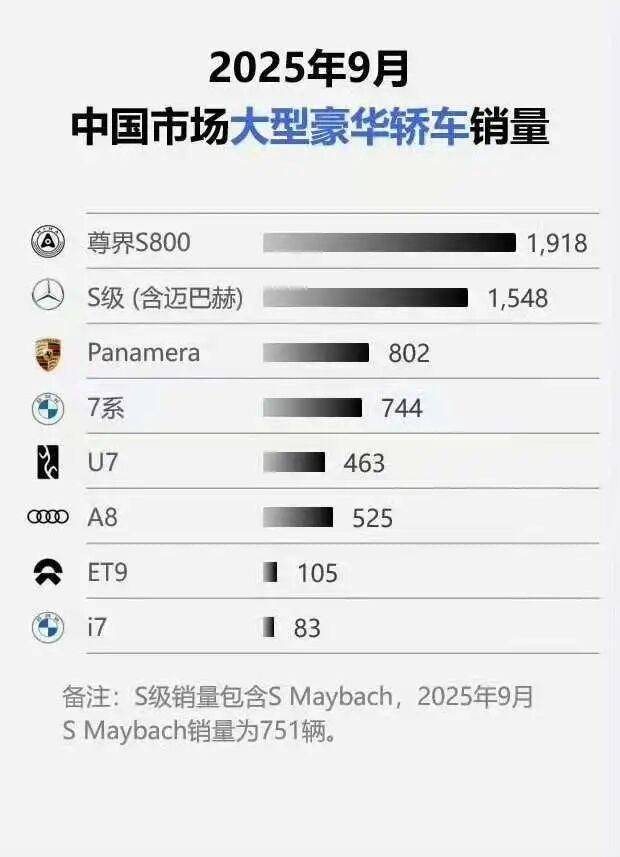 2025年9月中国市场大型豪华轿车销量排行榜中,尊界S800以1918辆的成绩稳居第一,而排在它后面的车型,有直接定义豪华的奔驰S级(含迈巴赫),也有驾控诠释豪华的宝马7系。