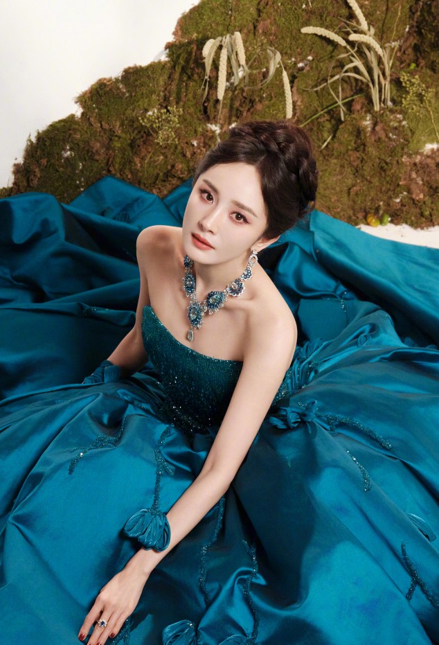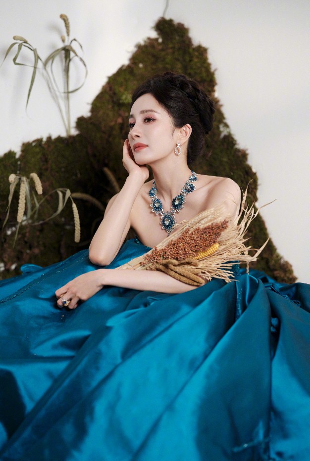 搭配的珠宝更是点睛之笔,同色系蓝宝项链以层次分明的设计感,与长裙色调完美呼应,每一颗宝石都折射出杨幂的自信锋芒;耳畔的钻饰耳坠则在简约中暗藏精致,举手投足间流光闪烁,让整体造型在华贵中又多了几分灵动。场景设计也颇具巧思,苔藓质感的背景与麦穗、植物元素相融合,将自然的野趣注入奢华造型中。这种都市高级感田园诗意感的碰撞,非但不违和,反而让杨幂的美多了几分故事性仿佛是误入秘境的贵族,带着尘世的光环,却又与自然共生。