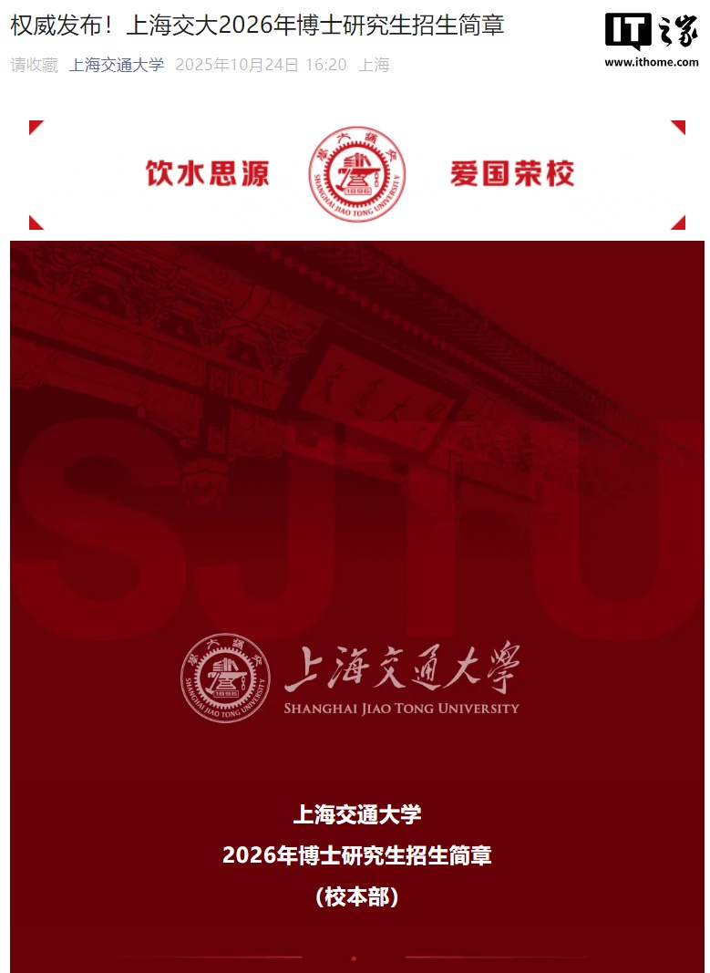 IT之家查询发现,上海交通大学(上海交大)于 10 月 24 日发布了 2026 年博士研究生招生简章(校本部),2026 年博士研究生计划招生规模 5000 名左右,其中校本部招生规模 4000 名左右。学校将根据学科建设需求和生源情况适当调整,最终招生规模以教育部正式下达的招生计划为准。
