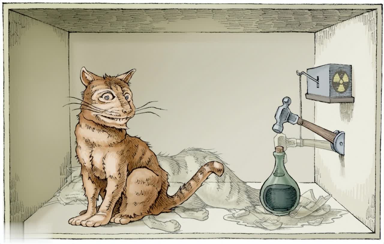 然后把这个箱子连接到一个装置,其中包含了一个原子核和毒气设施,这个原子核有百分之50的可能性发生衰变,衰变是发射出一个粒子,这个粒子将会触发毒气设施的开关,从而毒死箱子里的猫,原子核的衰变符合量子力学的原理,薛定谔认为,如果我们打开箱子去观测这只猫,那么我们就能够准确的判断出这只猫是不是活着,如果我们不打开箱子,那么我们就无法知道这只猫是不是活着,而这个时候猫存在两种可能性,它处于死亡和活着的叠加态当中,简单来说就是,只要我们不打开箱子,那么猫就应该处于既死又活,非死非活的诡异状态。