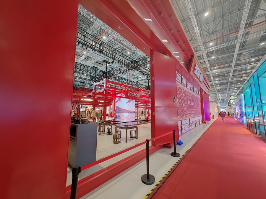 当然,消费品展区现场的布置同样“新”意满满。泡泡玛特展台的巨型棕褐色蛋糕格外吸睛,“潮玩顶流”LABUBU们挤挤挨挨地嵌在“塔身”;乐高展台充满“上海元素”,粉紫色的彩砖堆砌出东方明珠的轮廓,蓝色纹理的高楼仿若陆家嘴的摩天大厦,矮屋则拼出了石库门的肌理,展现出上海的独特魅力;V MUSE展台浸润着东方韵味,墙面的赤红绸缎如波浪翻卷,暗红色的花簇缠绕其间,中国红漆器描金工艺衬托着非遗的质感,展现出东方文化的深厚底蕴……