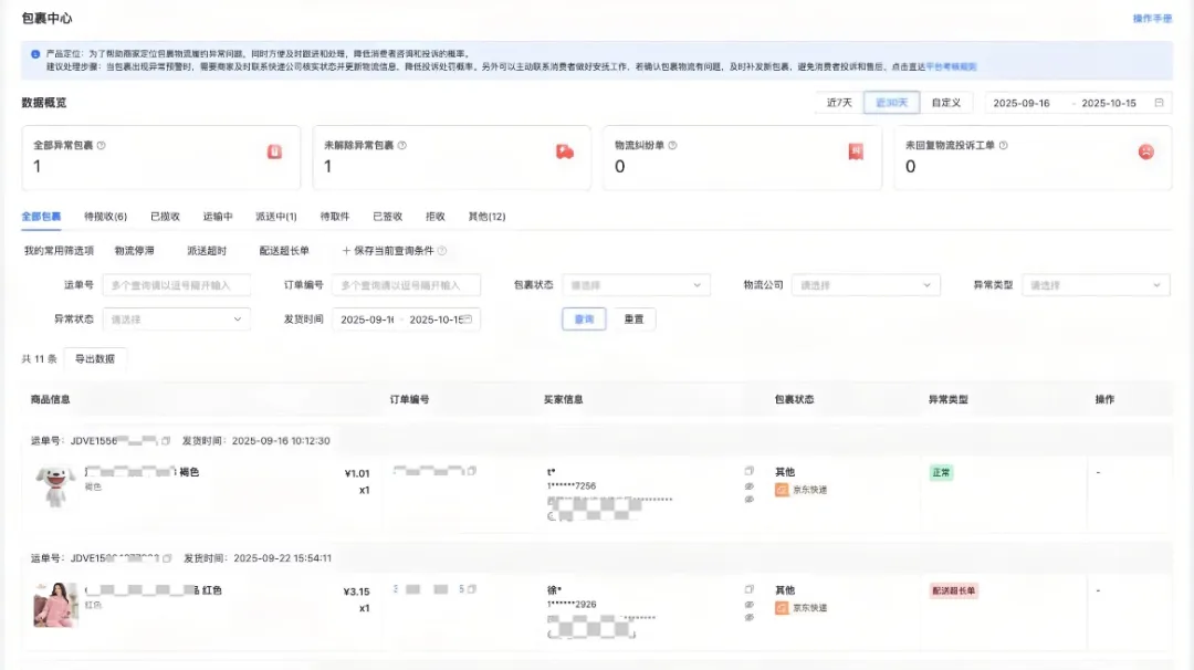 注意到这一点的京东,为了解决商家在物流履约环节面临的异常问题,在今年11.11期间上线了“包裹中心”功能。