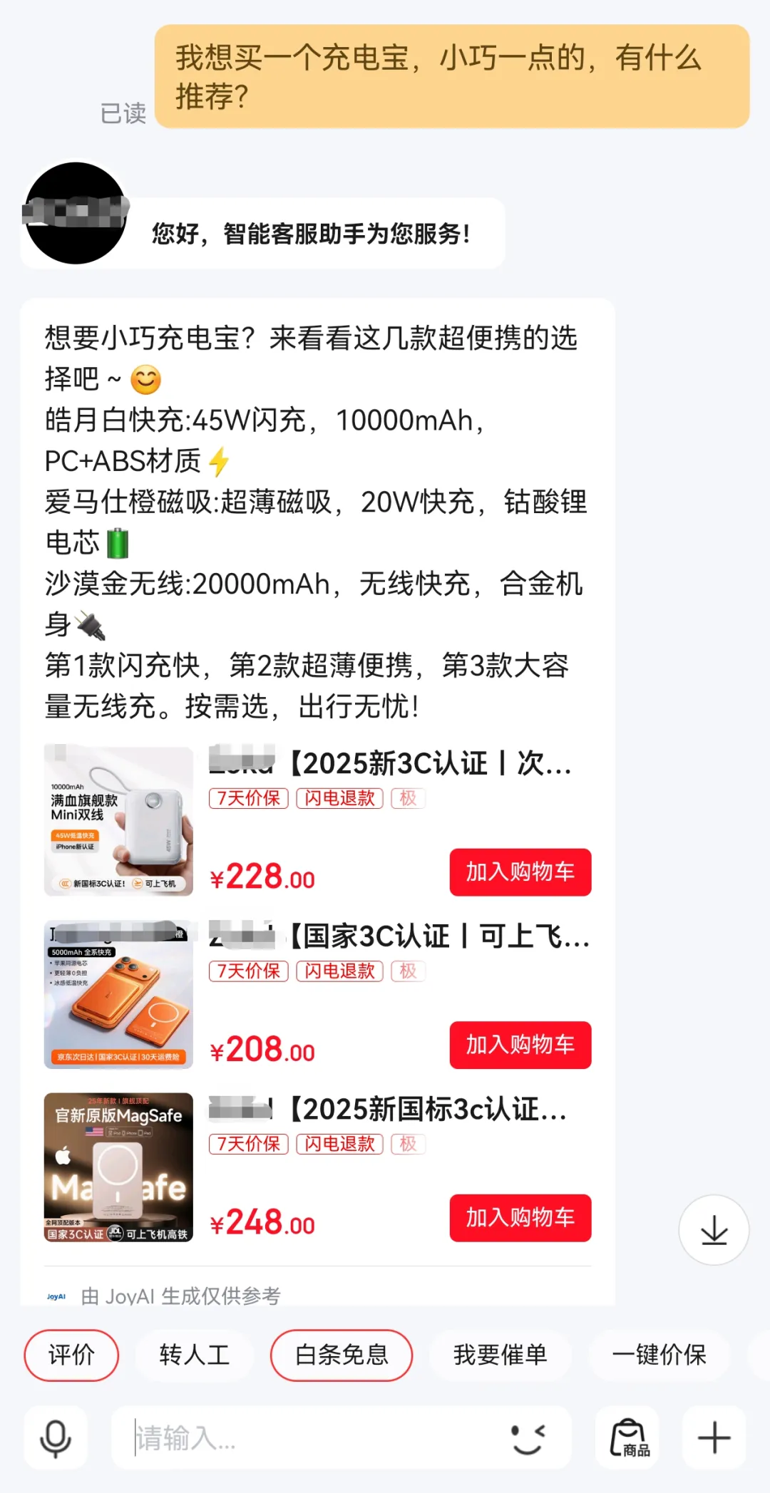 好在,京东免费的官方智能客服机器人改变了这一局面,一键开启、零门槛应用、24小时值守。尤其今年基于Agent技术深度升级后,机器人不仅能够根据客户意图主动推荐商品、解答优惠问题,还能处理物流查询、价保申请等高频售后场景的问题,显著降低了人工客服的压力。