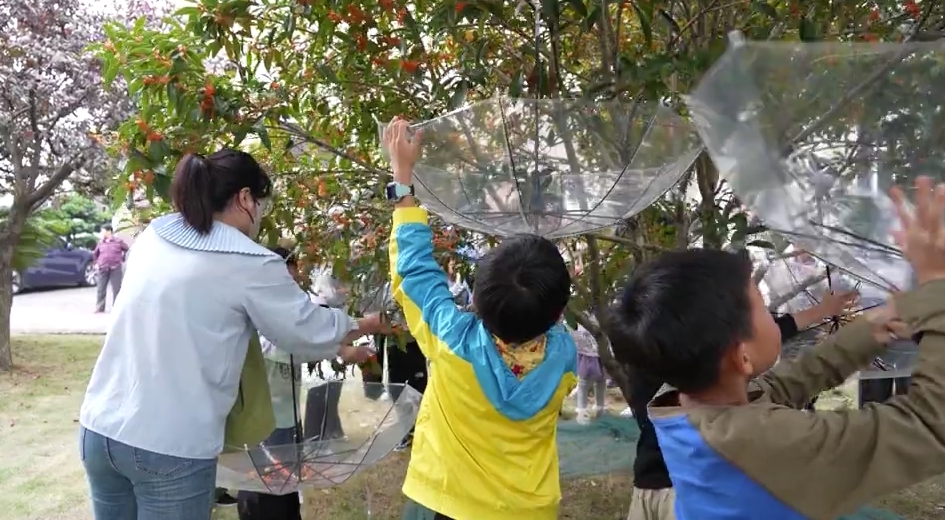 在刚刚过去的周末,就有15户家庭报名参加,一对对亲子家庭在指导老师的带领下,来到花树繁茂的桂花树下“打秋桂”。