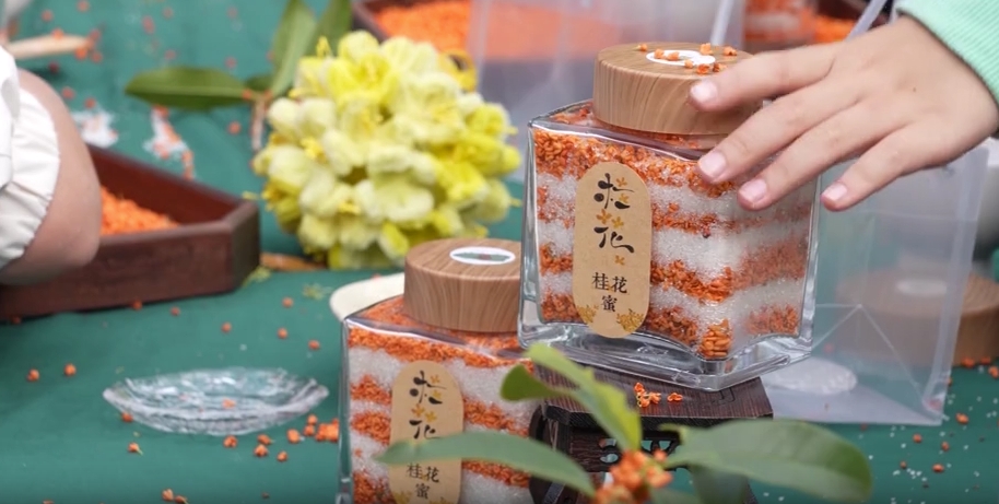 再挑选出一簇簇干净的桂花,细细纳入玻璃瓶中,一层桂花一层白糖的分层纳入,将大自然的秋日馈赠转化成了可以长久保存的甜蜜伴手礼。