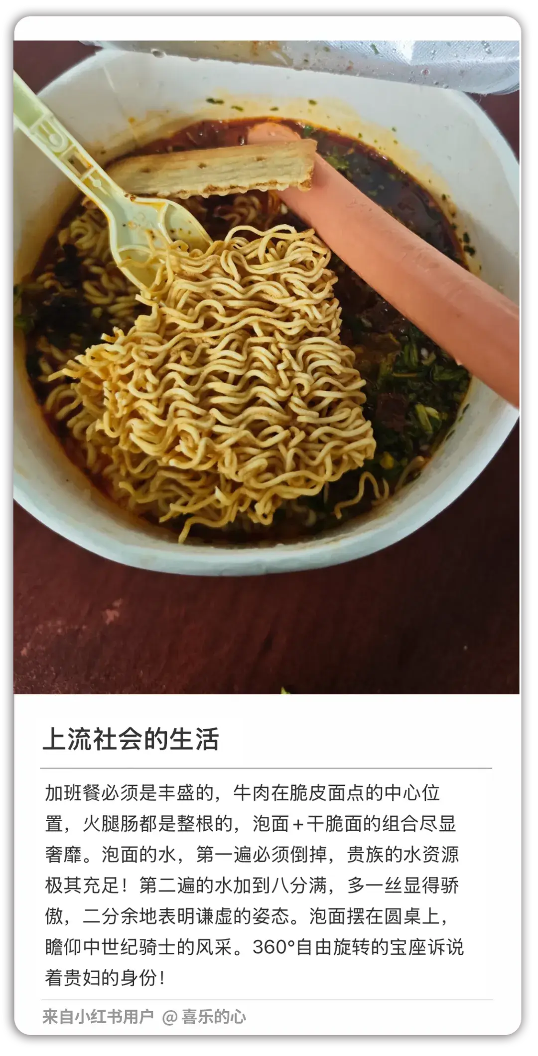 都是吃泡面,老一辈人觉得吃泡面是“穷”,得藏着掖着。年轻人觉得,如果袋装显得“寒酸”,那桶装不就“奢华”了吗?还不用洗碗!对自己好一点,就疯狂加卤蛋、加火腿肠,把一桶方便面吃出力所能及最“顶”的配置——别人怎么看根本不重要,反正只要自己觉得,我就是“方便面宇宙里的首富”。