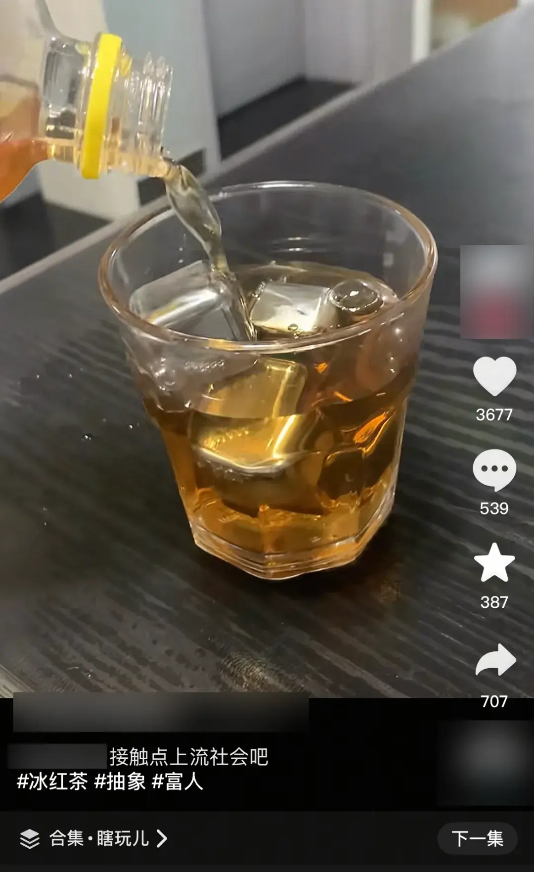 我仔细看了好几遍,不过是杯子里放着他爸喝威士忌专用的金属冰块,饮料是冰红茶,倒完还要煞有介事地摇晃几下。就这么个视频,要剪辑没剪辑,要内容没内容,居然火到被我刷到?点开评论区,回复清一色也都是类似的隔空举杯“遥祝”冰红茶。