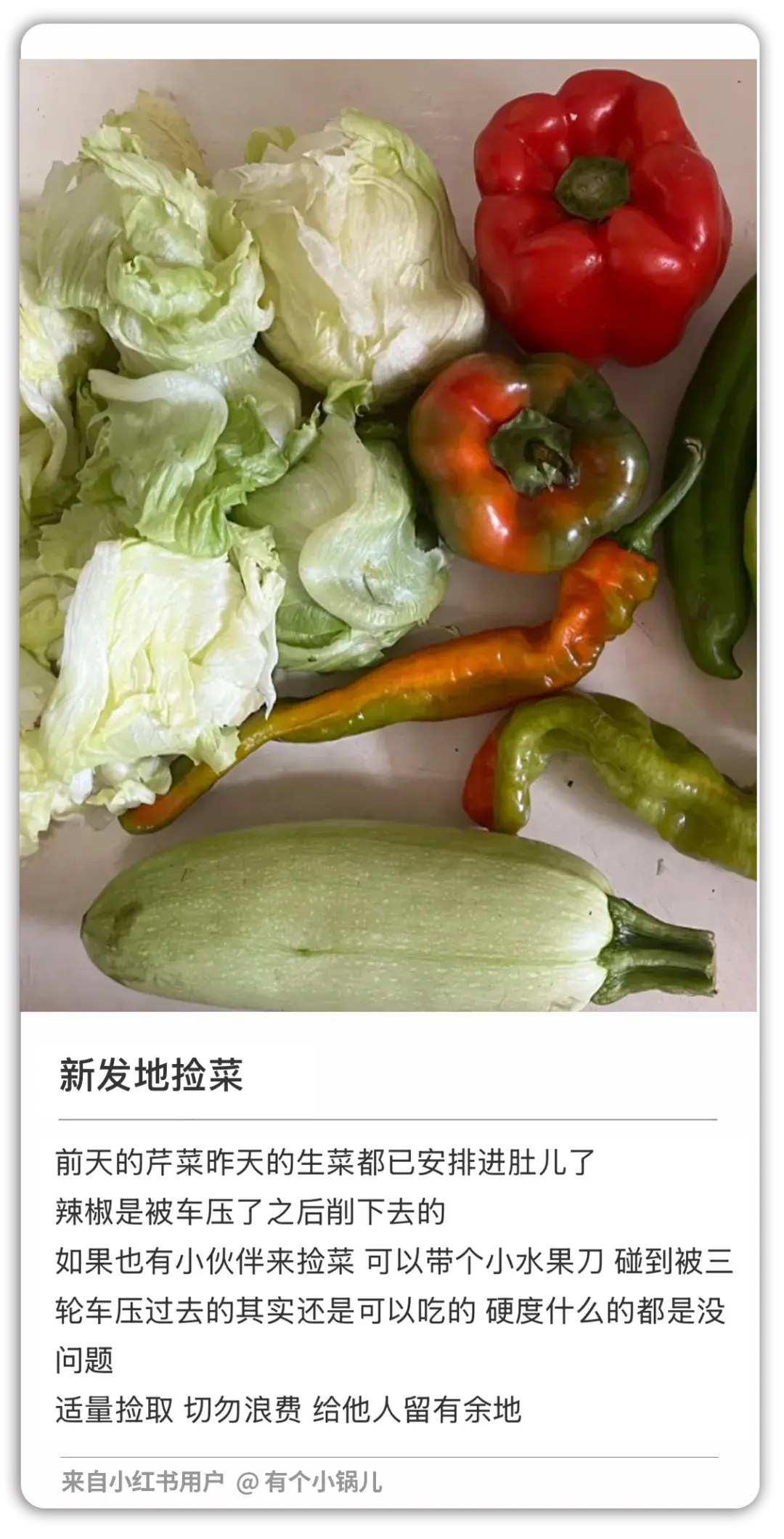 按照多个视频里的经验,一场成功的“内陆赶海”是有诀窍的。主要有两个宝地:一是你家附近你最熟悉的露天菜市场;另一个是本地的大型蔬菜批发交易市场。前者捡到品相完整的好菜几率较低,但可以实现实打实的零元购;后者更容易捡到成堆好物,缺点是要开车或转公交,还要卡准时间,到头来其实并没省下多少钱。