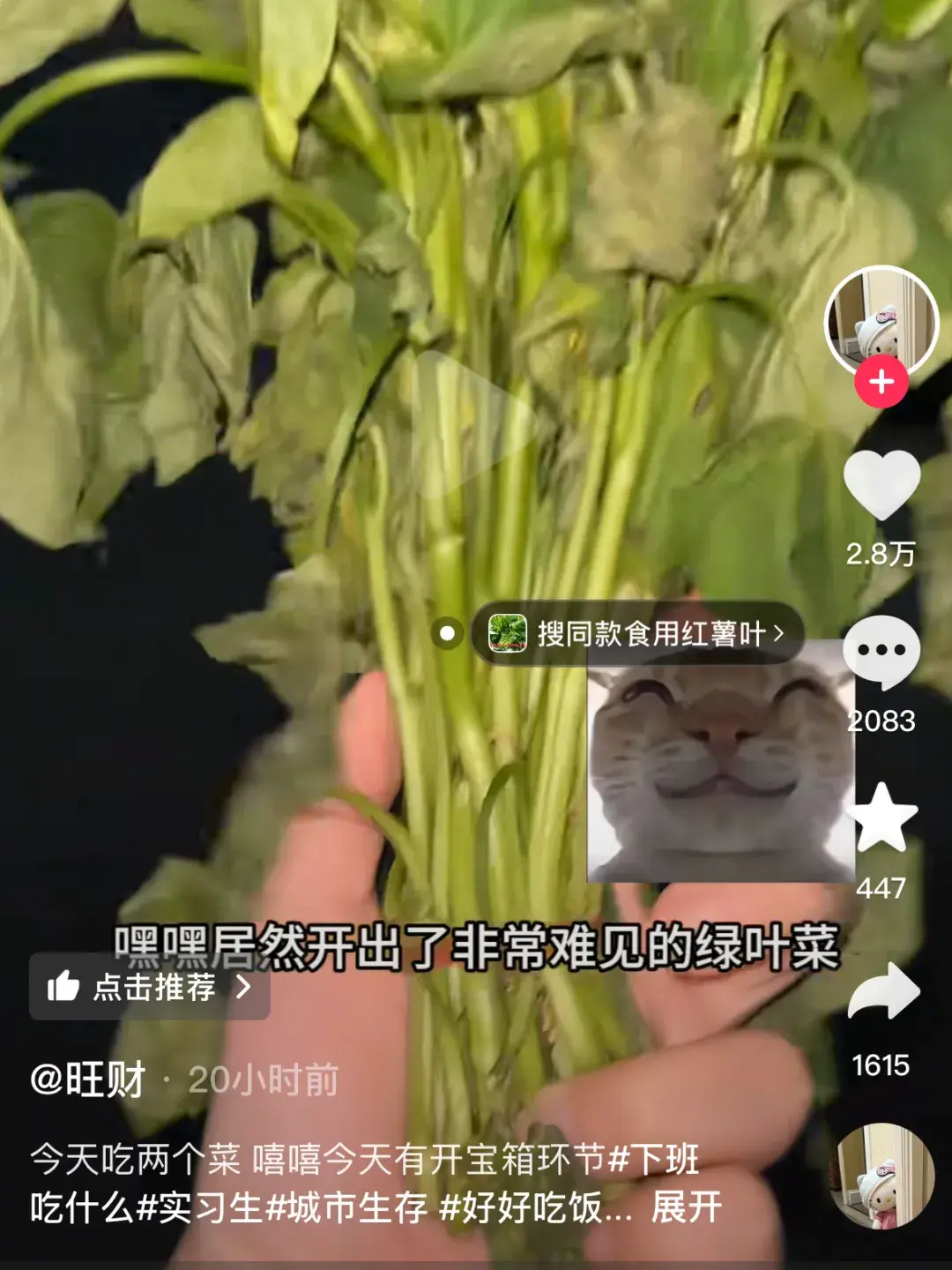 那个视频的开场是:“03年实习生下班都吃点啥”。一位带南方沿海口音的小姑娘,用第一视角记录自己在清晨即将收摊的菜市场里,搜寻品相还算完整的蔬菜。她一边拍摄、一边捡拾,还一边“解说”着自己的筛选标准: