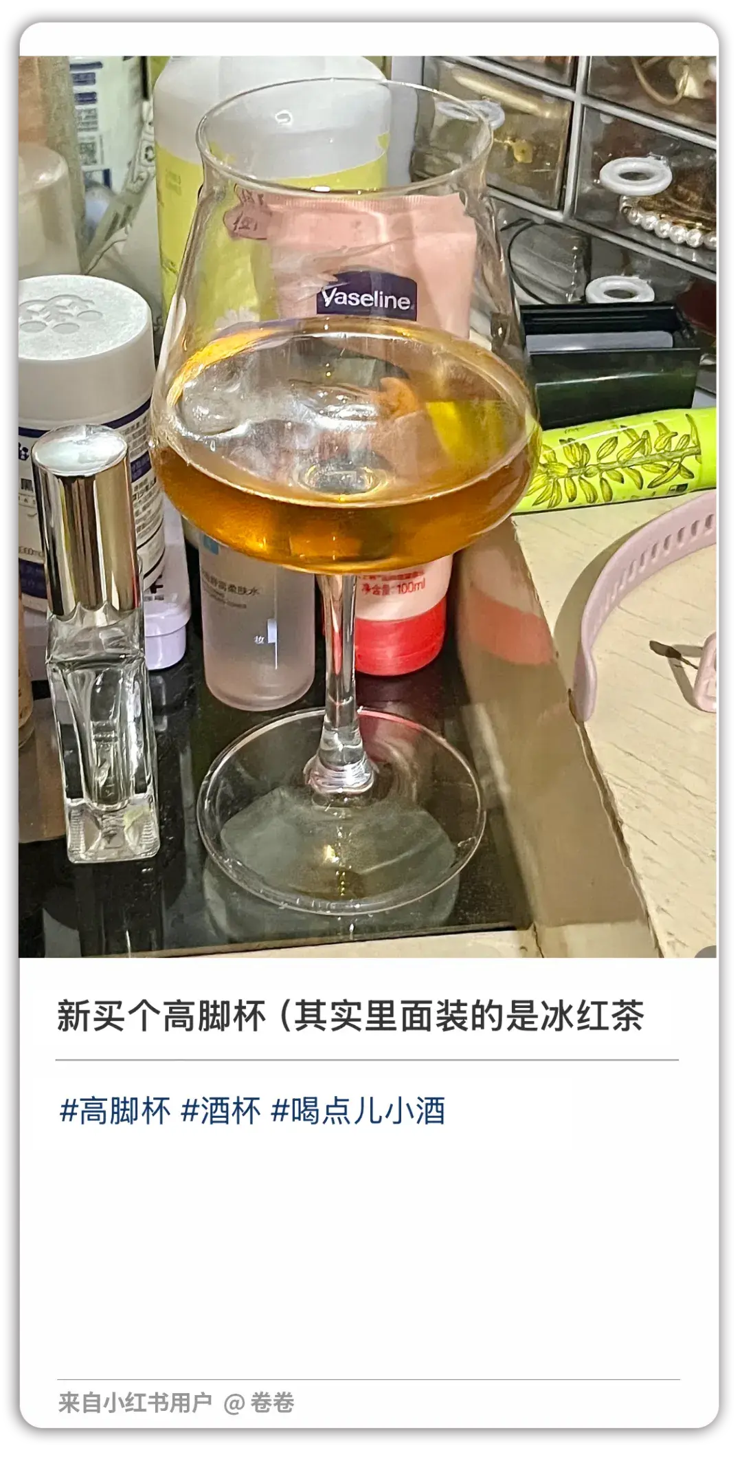 喝饮料,老一辈的白酒红酒买不起喝不懂,冰红茶可乐我还喝不上么?都说红酒要醒酒,凭什么冰红茶不可以。拿一个高脚杯,倒满冰红茶,谁能说我不是在享受生活呢?“出门在外身份都是自己给的”,我们就乐意把冰红茶捧成自己世界里的红葡萄酒。为什么不行?
