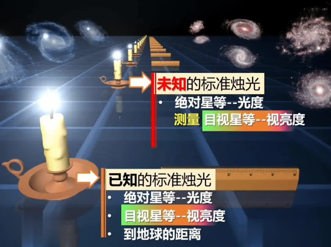 然后,选取足够远的造父变星作为标准烛光,测量其光变周期和亮度;最后,应用前述数据,通过三角函数计算,得出银河系的直径。