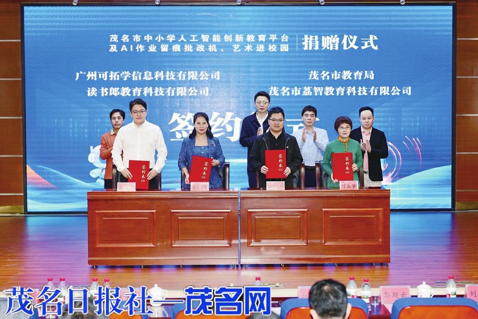 本报讯11月4日下午,“赋能教育智能化,共创茂名新未来——茂名市中小学人工智能创新教育平台及AI作业留痕批改机、艺术进校园捐赠仪式”在市教育局附属楼二楼报告厅举行。此次活动既是社会力量支持区域教育高质量发展的生动写照,也是茂名市推进“智能+教育”深度融合,构建高质量教育体系的关键举措。