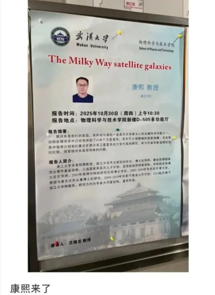 网友们纷纷调侃道“这是真的康熙来了”,还有人在评论区留言:“我们学校有个老师叫乾隆”。康熙教授是浙江大学物理学院求是特聘教授、天文研究所所长,长期从事天文领域研究。本次讲座题目为《银河系卫星星系》,旨在介绍最近在银河系卫星星系动力学方面的研究,并通过与宇宙学数值模拟比较,回答银河系是否特殊的问题。