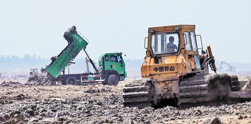七里海潟湖湿地生态减灾修复过程中,工程车进行拆除养殖围堰作业。(摄于2022年9月) 河北省地质矿产勘查开发局第八地质大队供图