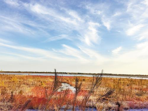 10月20日,七里海潟湖岸边大片大片的盐地碱蓬绽放出火红色彩。 本报记者 李冬云摄
