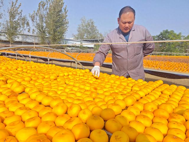 选果、去蒂、旋皮、晾晒、过风、上堆、包装……历经多年积淀,曹州耿饼已形成一套井然有序的制作工艺。杨存亮介绍,曹州耿饼皮薄肉厚、霜多无核、味醇香甜,每一道工序都需“精耕细作”。“今年我们收购了10万斤柿子,预计制作2万斤耿饼。”他一边翻晒耿饼一边说道。