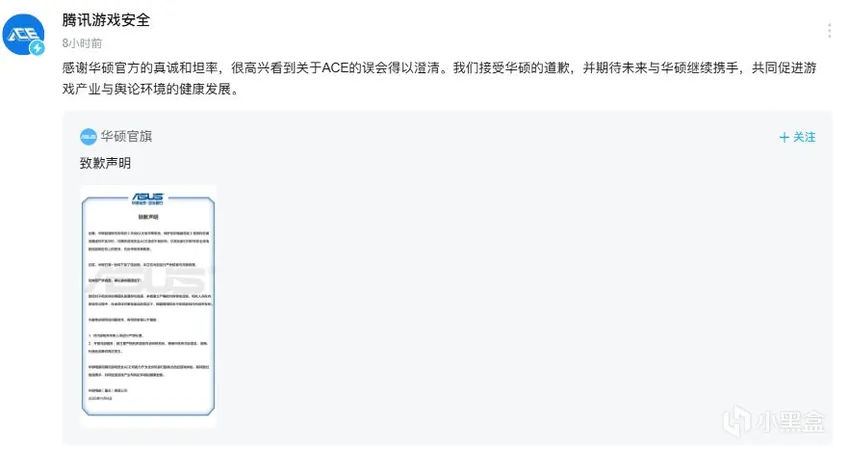【本文由小黑盒作者@muyu1于11月05日发布,转载请标明出处!】 华硕官方账号之前的发布《关闭ACE反作弊系统,保护你的电脑性能》视频,称视频存在错误描述和不实评价。 腾讯游戏安全也做出了回应