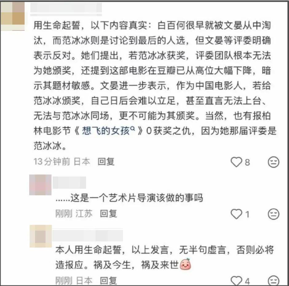 就在王传君登上领奖台的前一夜,更有IP显示为日本的网友用生命起誓,站出来爆料了东京电影节撕奖内幕,指责文晏为了给王传君撕奖连坑两位中国女星,还有因为自己柏林失奖就报复其他人的嫌疑。