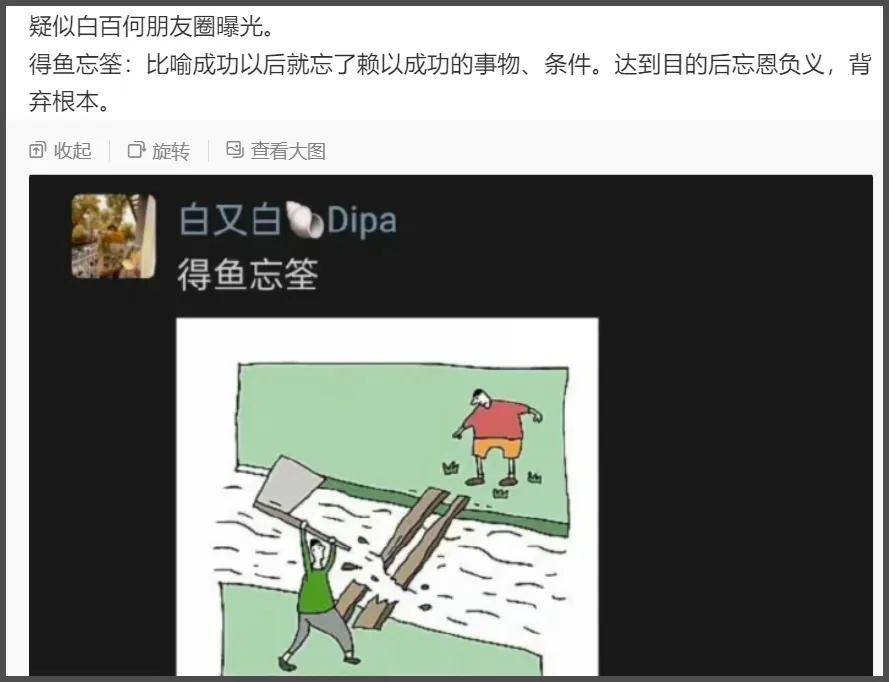 就在前几天,白百何一前一后在微博和朋友圈发了两条动态,一条感慨“还能这么操作”,还配上了“捂眼、捂耳朵、捂嘴”三个表情,一条感慨“得鱼忘筌”,配了一张过河拆桥的图片。