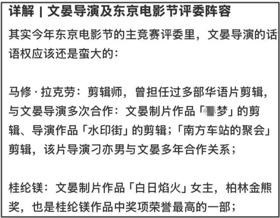 网友顺着爆料一路深扒,意外发现就2025年东京电影节五大评委阵容看,文晏确实有撕奖的能力,与两位评委颇具渊源,只要文晏有心发力,五中占三可谓是绝对优势。