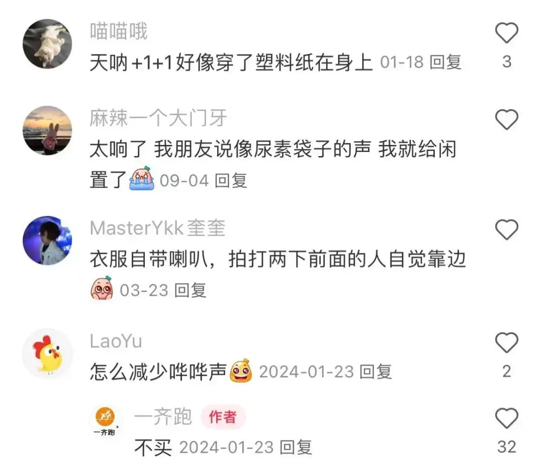 确实,一些冬季外套设计时考虑的大都是户外场景,使用了化纤的、偏硬的面料或涂层,没把静音需求考虑在内。