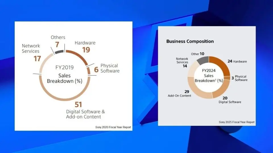 PS5 发售前一年,索尼报告称收入的6%来自实体游戏销售,次年该比例降至仅5%。这一数字在接下来几年里保持平稳,直到2023年降至 4%,去年继续降至 3%——这也是 PlayStation实体游戏销售占比有史以来最低的一次,仅为 PS4 世代末期的一半。
