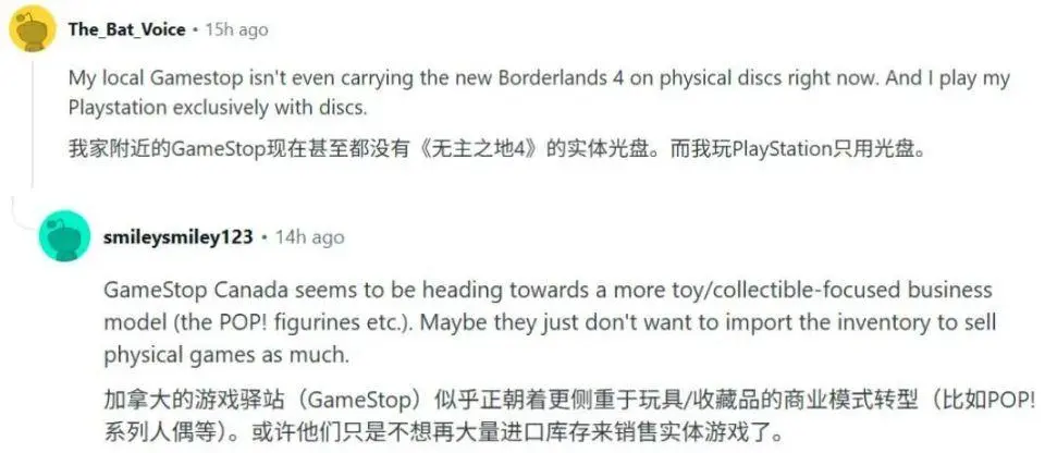 玩家消费习惯的集体改变,也对线下游戏零售商产生了影响。加拿大玩家提到,当地GameStop正倾向于销售玩具、收藏品,而不是实体游戏。也有人表示赞同,自己附近的GameStop甚至没有刚刚发售的《无主之地4》实体版,这可急坏了部分光盘党。