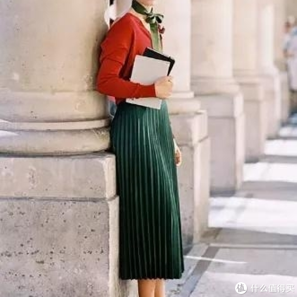 墨绿色的高腰百褶裙,搭配红色的针织衫,是红配绿的正面CP了,把知性优雅的气质、内敛温婉的品位都展现出来了,显高显瘦大方又得体的秋冬搭配。