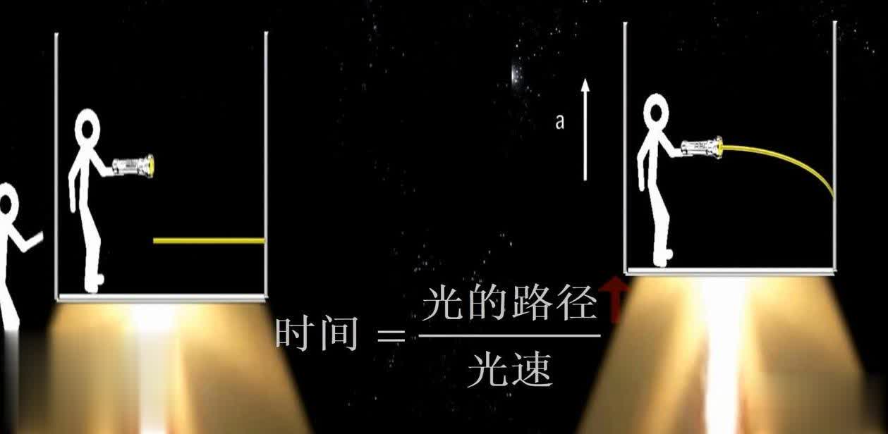 狭义相对论的局限性让爱因斯坦开始思考引力问题。在1907年,他在专利局工作时,突然想到一个思想实验,假如一个人在一个封闭电梯中,如果电梯在太空中以9.8米每秒的速度匀加速向上,你会感觉有“重力”如果电梯在地球上自由落体,你会感觉失重。 这个思想实验让他“悟出”在局部区域无法区分引力和惯性力,这就是等效原理。