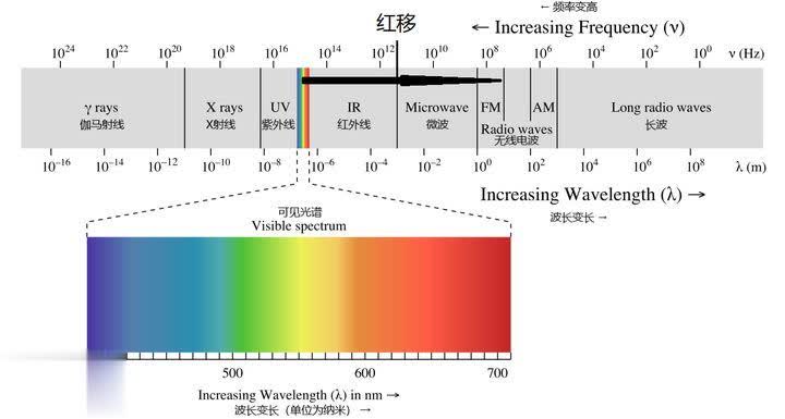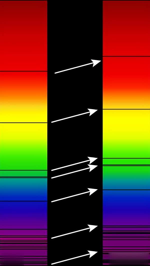 图右是遥远的星系在可见光波段的光谱,与图左太阳的光谱比较,可以看见谱线朝红色的方向移动,即波长增加(频率降低)