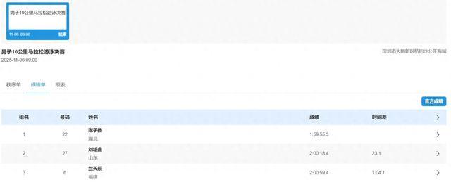 11月6日,第十五届全运会男子10公里马拉松游泳项目决赛在深圳桔钓沙公开海域展开。湖北选手张子扬表现出色,以1:59:55.3的优异成绩,以卫冕之姿摘得该项目金牌,湖北体育代表团收获本届全运会第三枚金牌。 张子扬