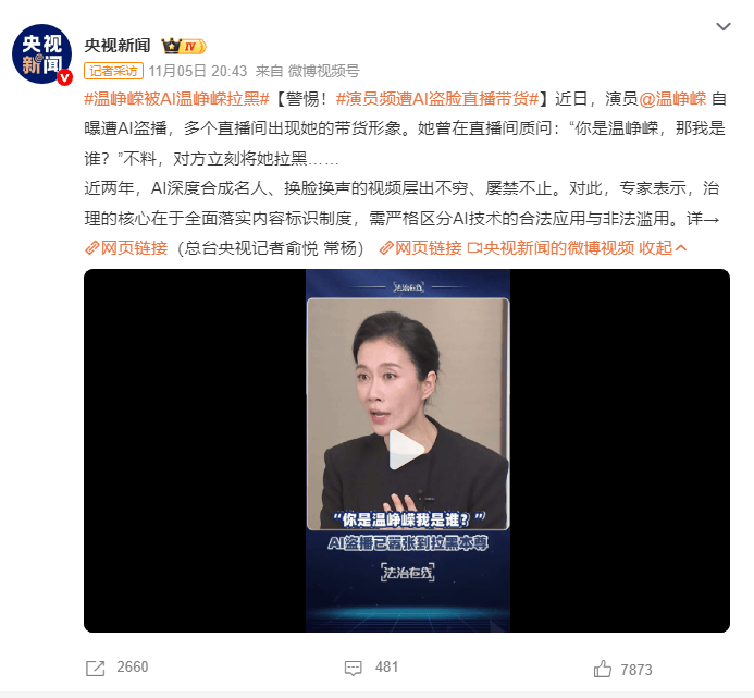 近日,演员温峥嵘自曝遭AI盗播,多个直播间出现她的带货形象。她曾在直播间质问:“你是温峥嵘,那我是谁?”不料,对方立刻将她拉黑。