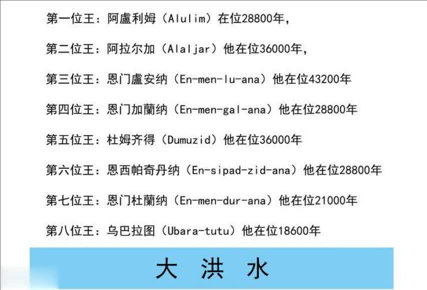 这个文明大约在4000年前被阿卡的帝国所取代,考古学家在苏美尔文明的遗址当中,发现了“王表”,上面记录了苏美尔时期各个帝王在位的顺序和时间,这倒是并不稀奇,但是让科学家感到惊讶的是,最早的8位帝王,都在位了几万年,按照苏美尔王表的记载来看,在苏美尔文明发展的进程中,曾经爆发过一次大洪水。这场大洪水和《旧约》中的“诺亚方舟”时期相重合。而在洪水之前,苏美尔总共有8位王,这8个王在位的时间加起来超过了24万年!大洪水褪去之后,王表记载的王,其寿命年龄就和现代人更加接近,稳定在了100岁左右,但洪水前的统治,却并不一样。