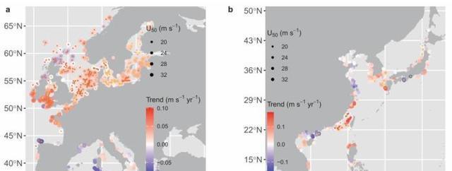 研究团队还发现,亚洲和欧洲约40%以上的现役和规划中海上风电场位于风速超过三级涡轮机设计载荷(设计能承受的最大风速为每秒37.5米)的区域。同时,超过一半的相关海域极端风速呈显著增强态势。他们认为,该增强模式与全球变暖下的气旋活动变化有关。