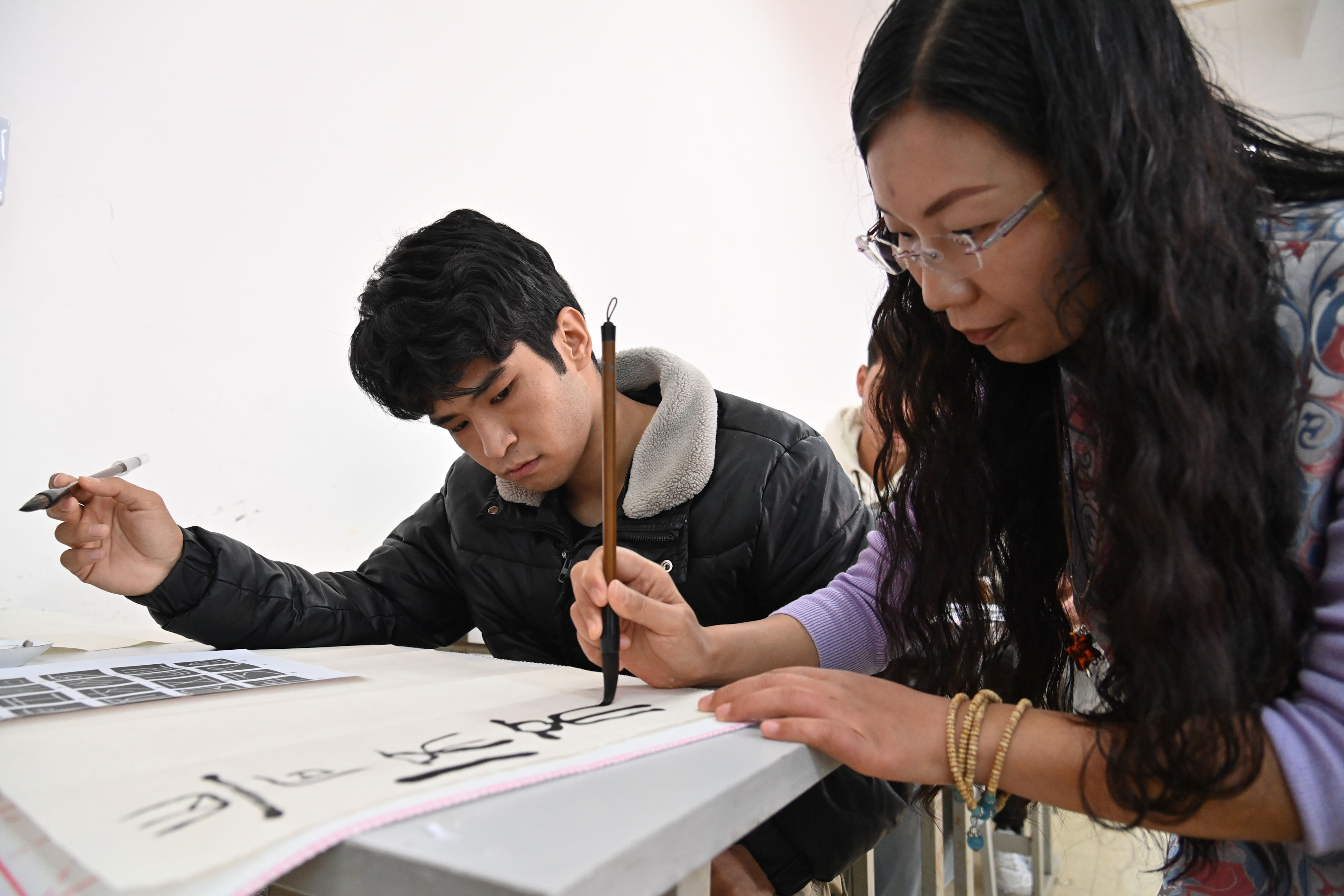 ▲11月4日,在位于沙坪坝区的重庆建筑科技职业学院,外国留学生在老师指导下学习书法。特约摄影 孙凯芳