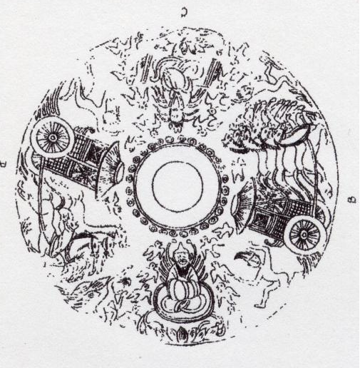 幸运的是,我们找到了一枚东汉画像镜,即浙江省博物馆收藏的一枚东汉车马神人画像镜。其无论是构图形式还是主体元素,都与这件仿制品高度一致。镜背主纹中的主要图像也是上下对称的两身坐姿人物和左右对称的两部车马(图3)。马车一望便知与仿制品的是同一类型:车厢皆为正方体,皆表现出清晰的车窗棂格,车厢顶篷皆呈椭圆形伞盖状,马车行驶的方向也一致。甚至两部对称的车马与水平线保持了一定斜度的做法二者也完全一致,而且倾斜的方向也完全一致。至于这枚铜镜的两身人物,分别为戴山形冠的东王公(上)和西王母(下)。最新的考古发现表明,作为男性的“阳仙”东王公与作为女性的“阴仙”西王母对应的传说及其图像组合模式,在西汉宣帝(前74—前48年在位)时期,即公元前1世纪前期,已经成型(刘子亮、杨军、徐长青《汉代东王公传说与图像新探——以西汉海昏侯刘贺墓出土“孔子衣镜”为线索》,《文物》2018年第11期),东汉时期进一步流行。东王公与西王母上下对称布局,以及皆呈坐姿的做法,都与仿制品的一致,仿制品的原件仅仅将东王公与西王母置换成了佛陀和老子。