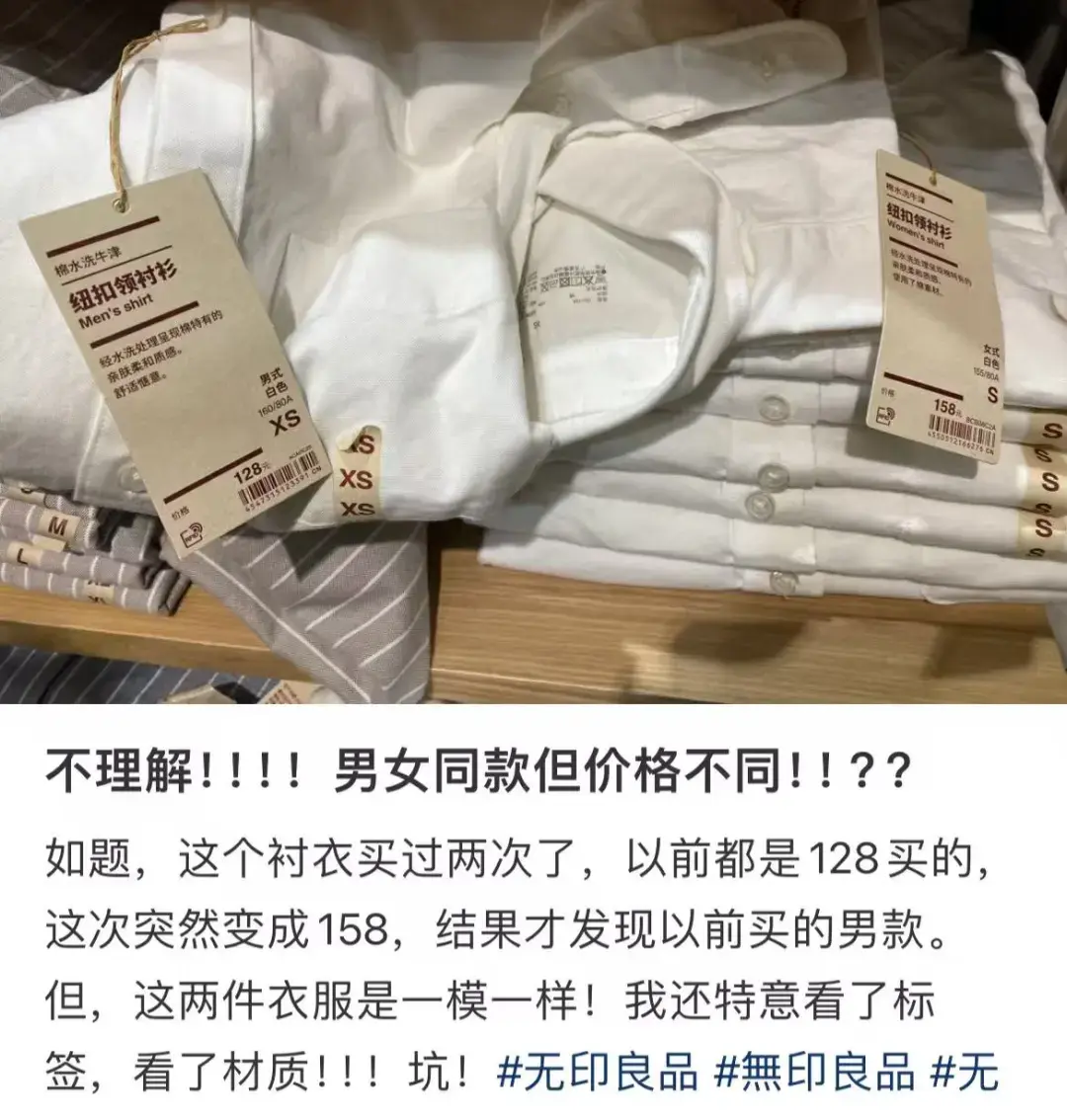 款式、材质一模一样的无印良品纽扣领衬衫,男款售价128元,女款却毫无道理地贵了30元。