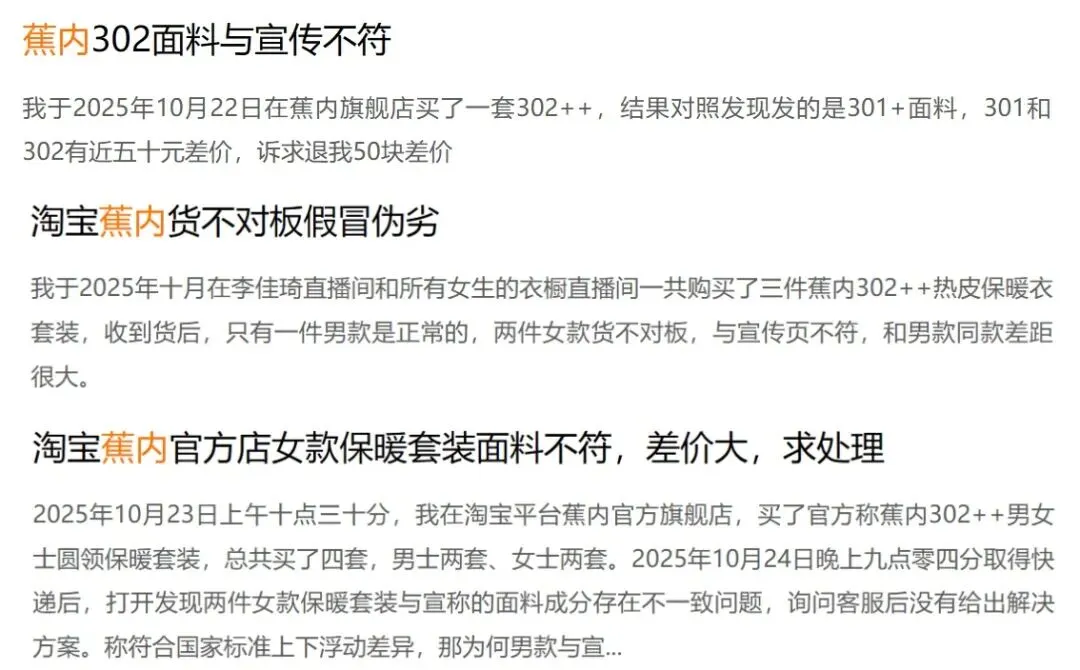 有网友买了多件蕉内保暖内衣后,发现有且仅有女款“货不对板”。