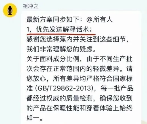 面对“挂羊头卖狗肉”的争议,蕉内官方旗舰店的客服,不慎发出了未经删减的“解释话术”。