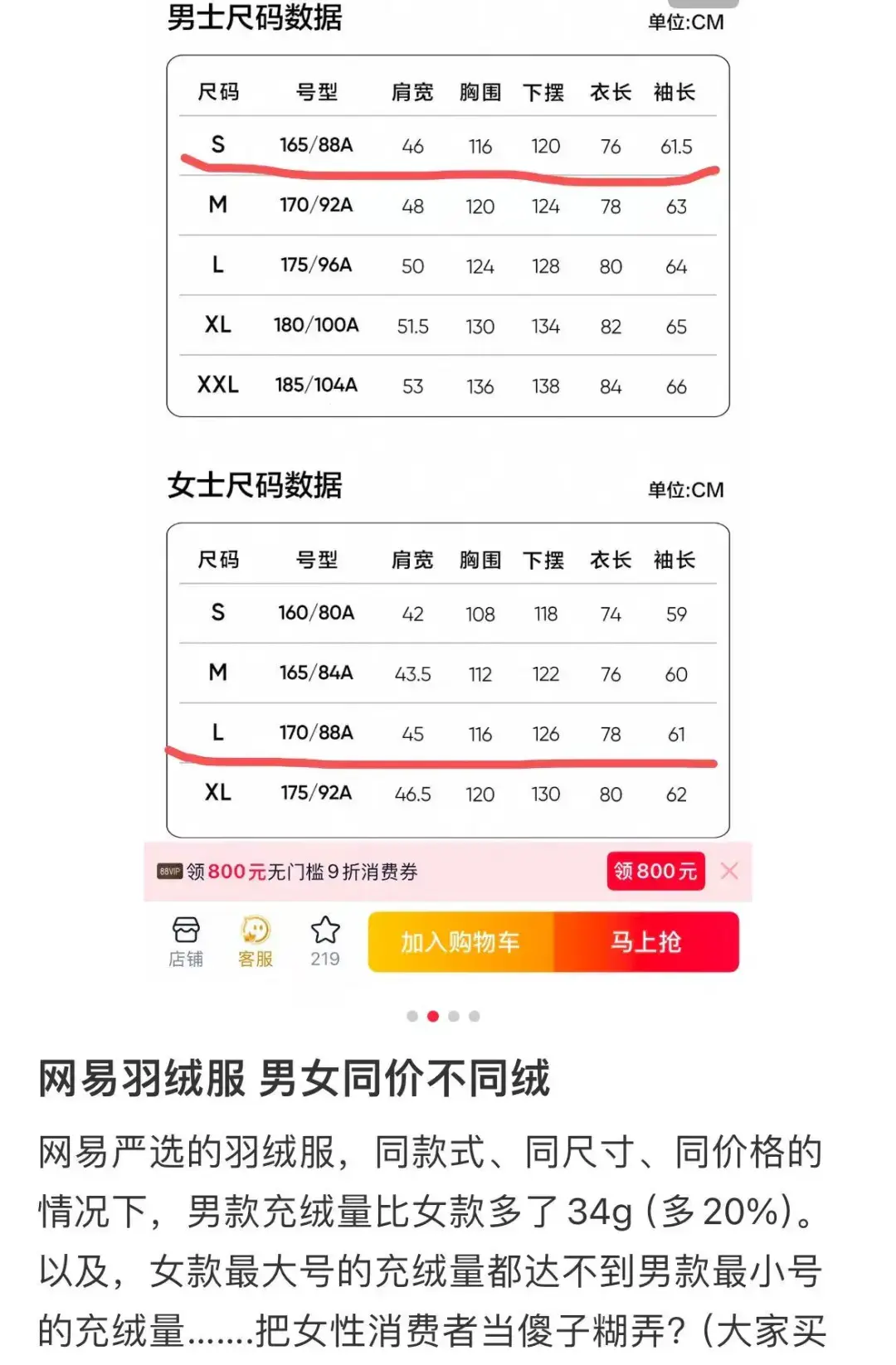一款标价1999元的羽绒服,女款最大码,在肩宽、胸围、衣长、袖长均大于男款最小码的情况下,充绒量仍然比后者低了近30克。