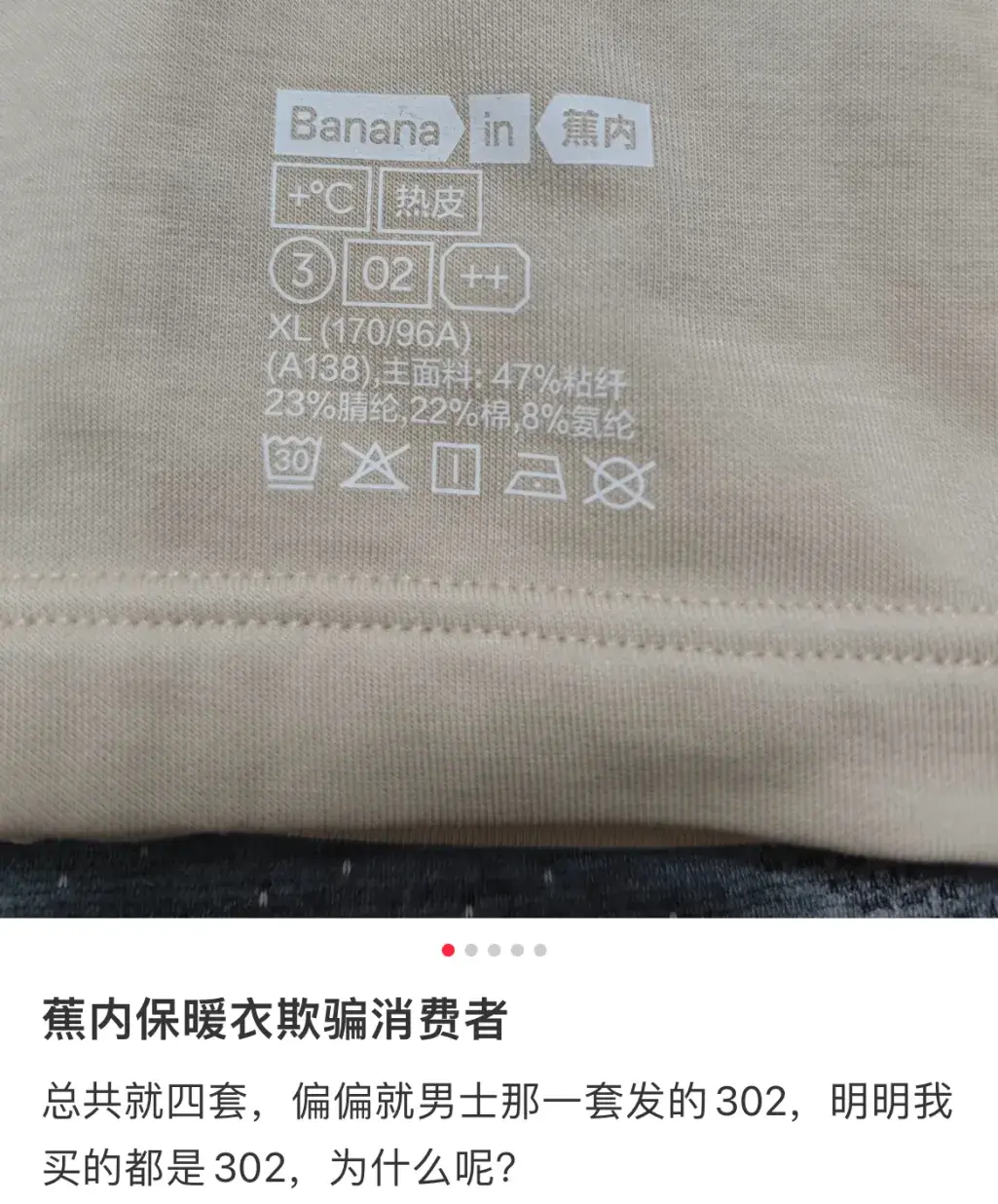 而该网友收到的衣物,印刷在内侧的文字显示,其主面料为“47%粘纤、23%腈纶、22%棉、8%氨纶”。这些面料成分的参数所对应的,是价格更低的“301+”款保暖衣,它比“302++”款便宜了50元。