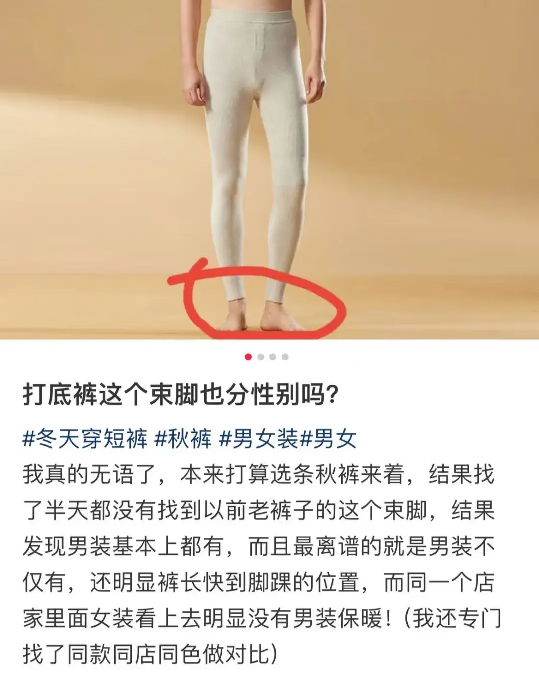 因为裤腿太短、裤脚太容易往上跑,有人想买条拥有束脚的打底裤,随即发现,束脚设计并非消失了,它依旧是男款秋裤的常见设计,唯独在女款秋裤中,难寻踪迹。