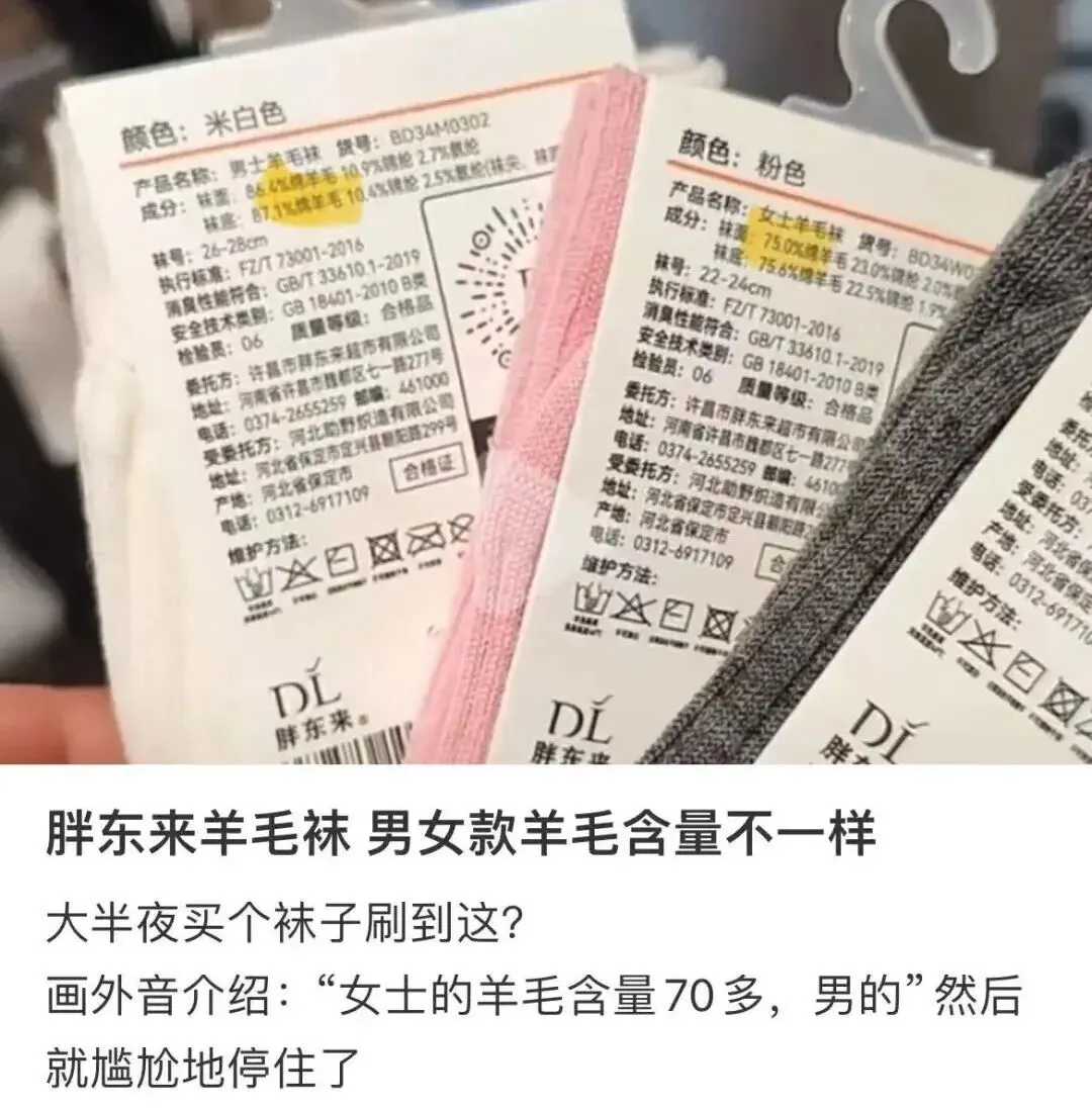 以细致入微的人文关怀著称的胖东来,推出男女同款羊毛袜,价格相同,而男款的绵羊毛含量,比女款高出10%。