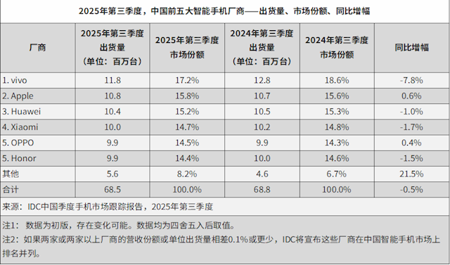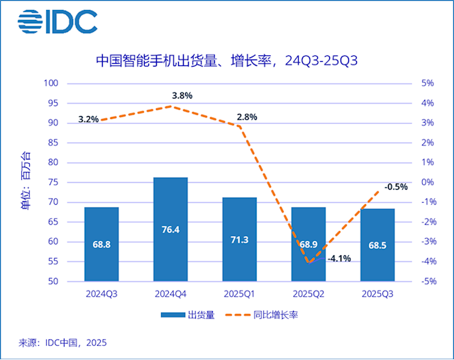 快科技11月7日消息,根据IDC最新手机季度跟踪报告显示,2025年第三季度,中国智能手机出货量约6846万台,同比下降0.5%,延续下降趋势。