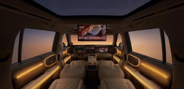车内配备手机双无线充电面板、15.6英寸副驾娱乐屏、21.5英寸后排娱乐屏、后排小桌板、车载小冰箱、二排右侧零重力座椅、座椅通风加热按摩等功能、电动车门,甚至是520线激光雷达都应有尽有。