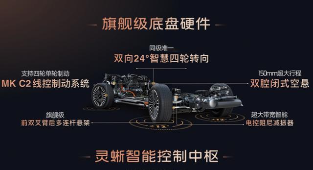 同时新车还配备全向24度的后轮转向系统,能降低转弯半径,提升驾驶灵活性。另外,智己LS9还配备150mm行程闭式双腔空气悬架、可变阻尼减振器、线控转向等技术。