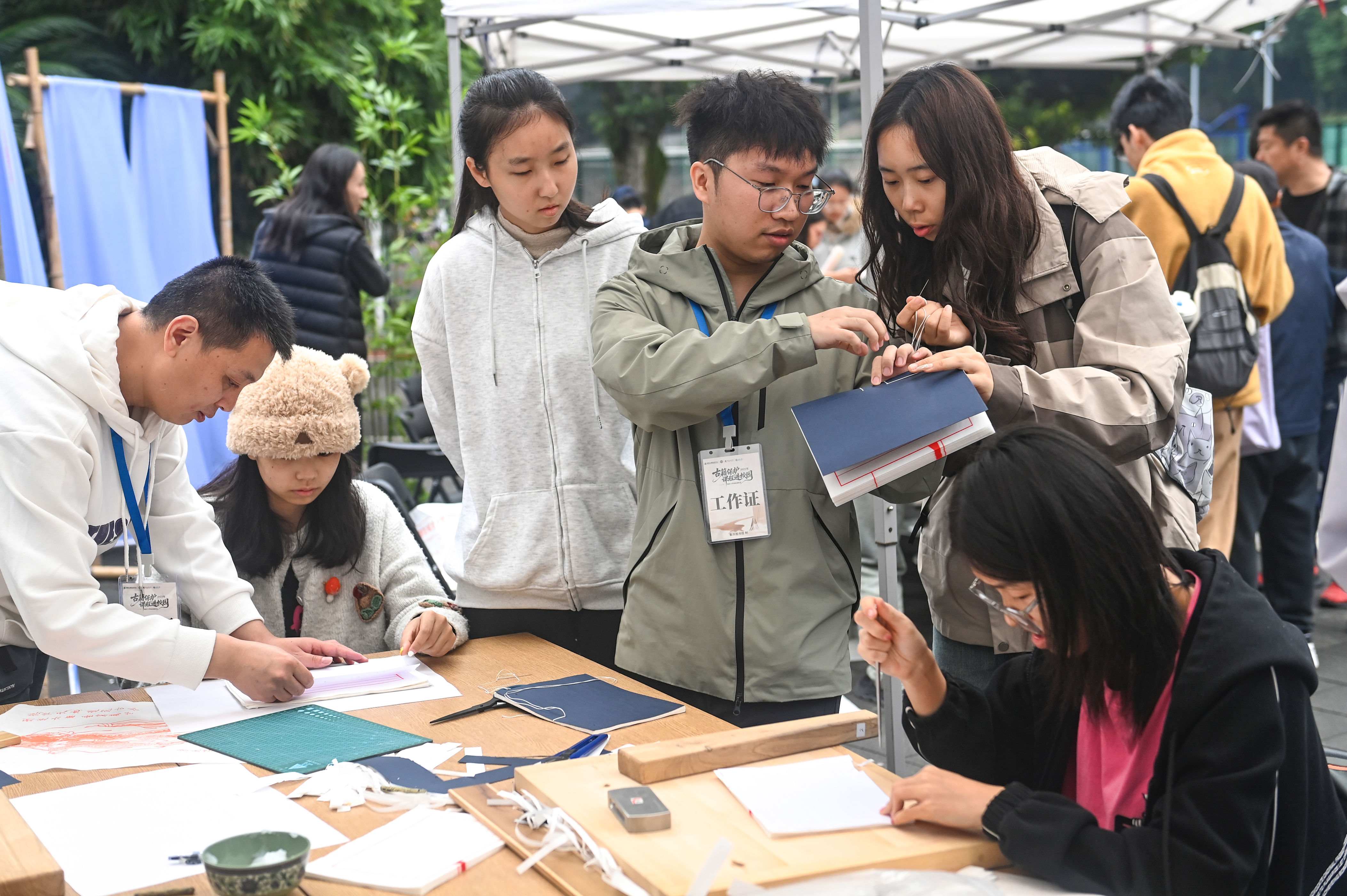 ▲11月6日,重庆大学沙坪坝校区,同学们正在体验古籍保护的各种传统技艺。记者 郑宇 摄