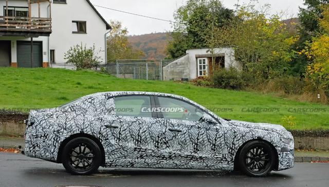 侧身来看,奔驰E级EQ与全新的奔驰E级燃油车保持了很高的相似度,特别是在车窗线与车门之间的比例处置上,奔驰还是试图让车辆保持品牌的一些经典元素,这一点应该是会受到忠实用户欢迎的。不过,车辆在测试车上采用了机械车门把手造型,还在侧身产生了宽体比较明显的侧包围,不知道这会不会是新车的重要调整。但我个人觉得在隐藏车门把手受争议的当下,如果奔驰真能这么干,其实还是挺讨喜的。