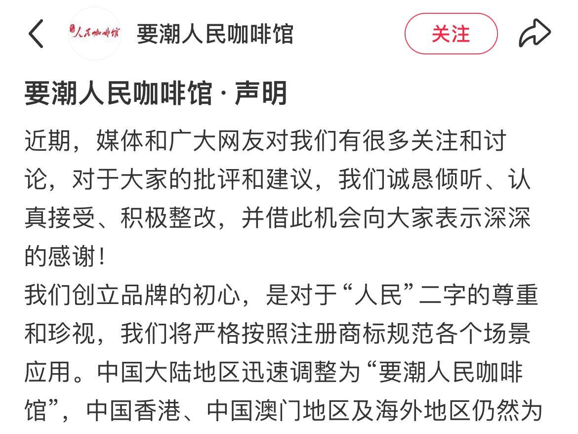 在舆论压力下,11月8日,该咖啡馆发布致歉声明,表示对大家的批评和建议“诚恳倾听、认真接受、积极整改”,宣布全面启动整改工作。中国大陆地区所有门店门头将加上“要潮”,规范使用“要潮人民咖啡馆”名称。